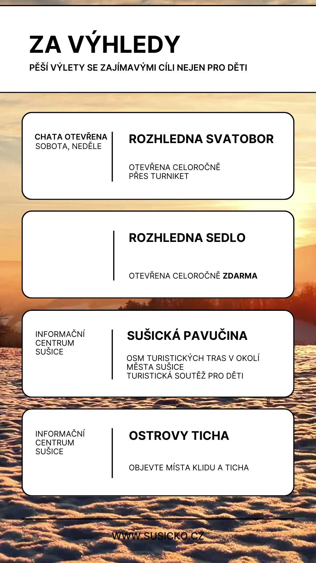 Toulání po kopcích a kopečcích kolem města Sušice je boží v každé roční době. Město má hned dvě kouzelné rozhledny a obě jsou otevřené celoročně. Ta na Sedle dokonce zdarma.